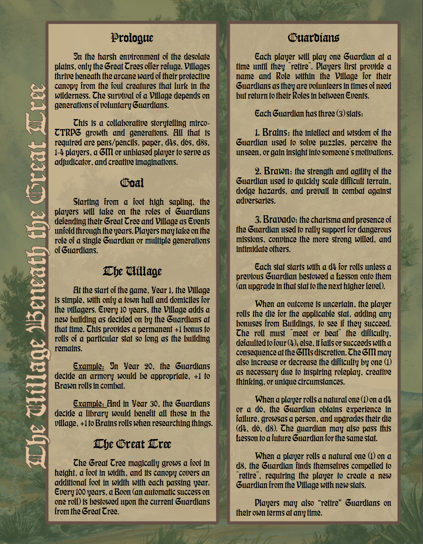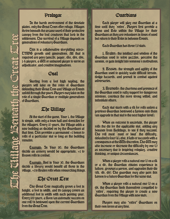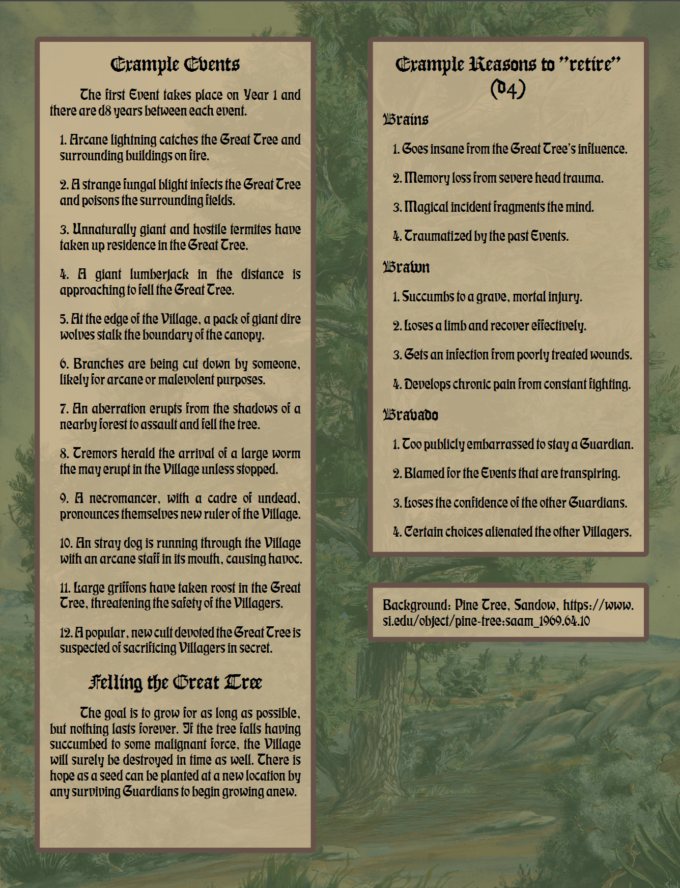 Starting from a foot high sapling, the players will take on the roles of Guardians defending their Great Tree and Village as Events unfold through the years. Players may take on the role of a single Guardian or multiple generations of Guardians.